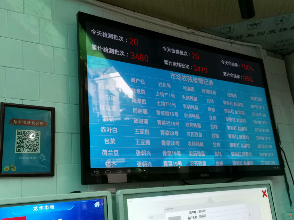 而在市场公共区域,电子显示屏也将所有摊档经营食材农残检测情况等信息完整展示。消费者对照电子屏,就能清楚掌握整个市场摊档情况,哪个摊档有保障、哪个摊档有问题,皆一目了然。