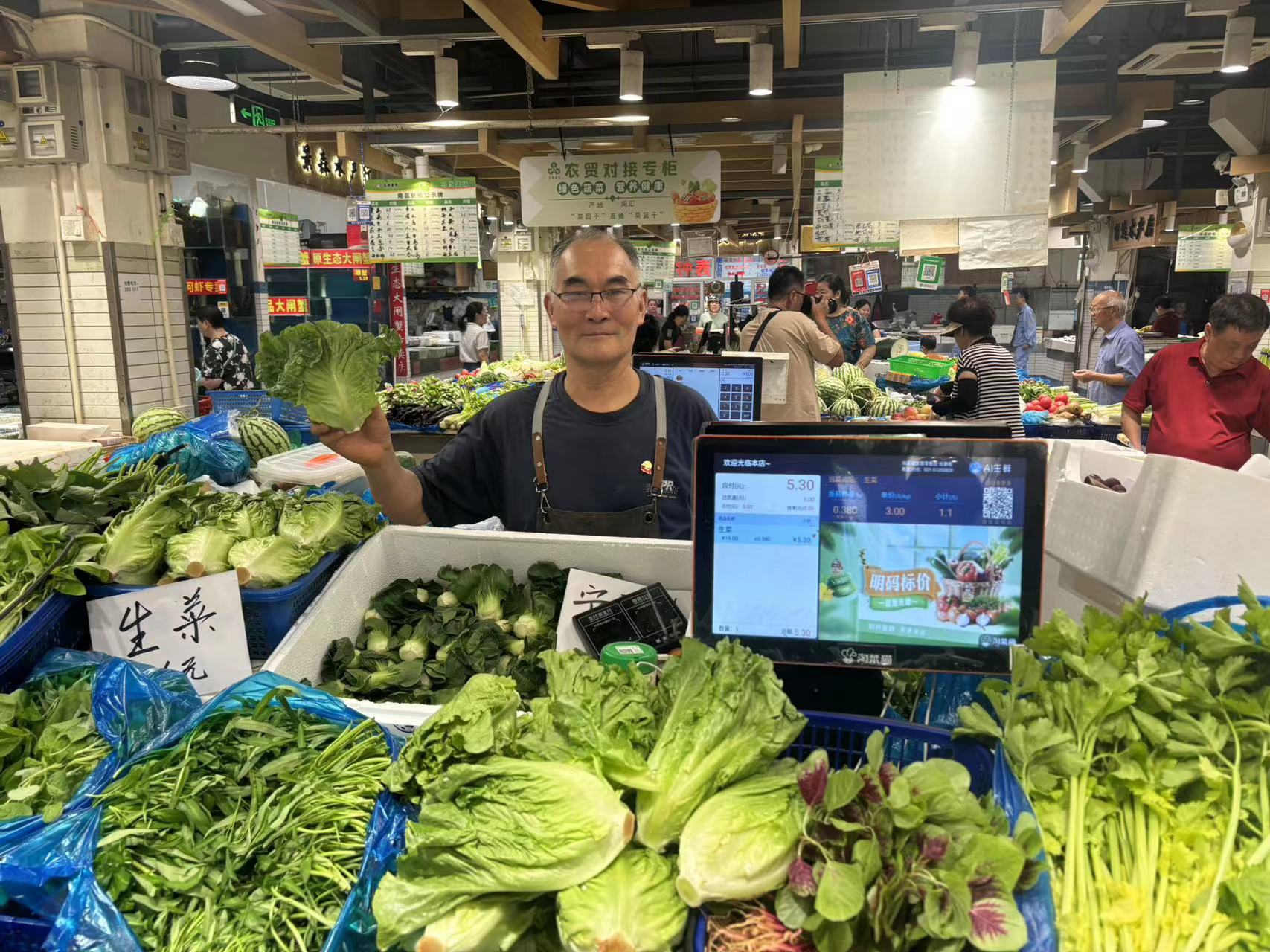 现场,菜场运营方负责人演示了电子秤的使用方式,它能够自动识别交易菜品的品名、单价、重量和总价等信息,并实时采集、汇总显示在屏幕上;此外,经营户还可以通过智能秤商户端小程序,了解每日销售数据,精准调整进货策略,提升摊位的营收率。目前,这样的ai智能识别电子秤已在马当菜场所有商户实现了全覆盖。