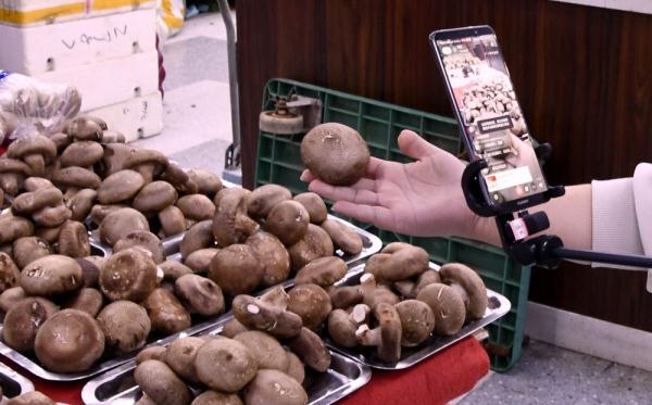↑ 12月8日,“车客家园数字化菜市场”中心店工作人员在市场内通过网络直播介绍农产品。
