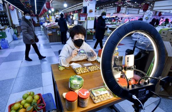 ↑ 12月8日,“车客家园数字化菜市场”中心店工作人员在市场内通过网络直播介绍干果副食。