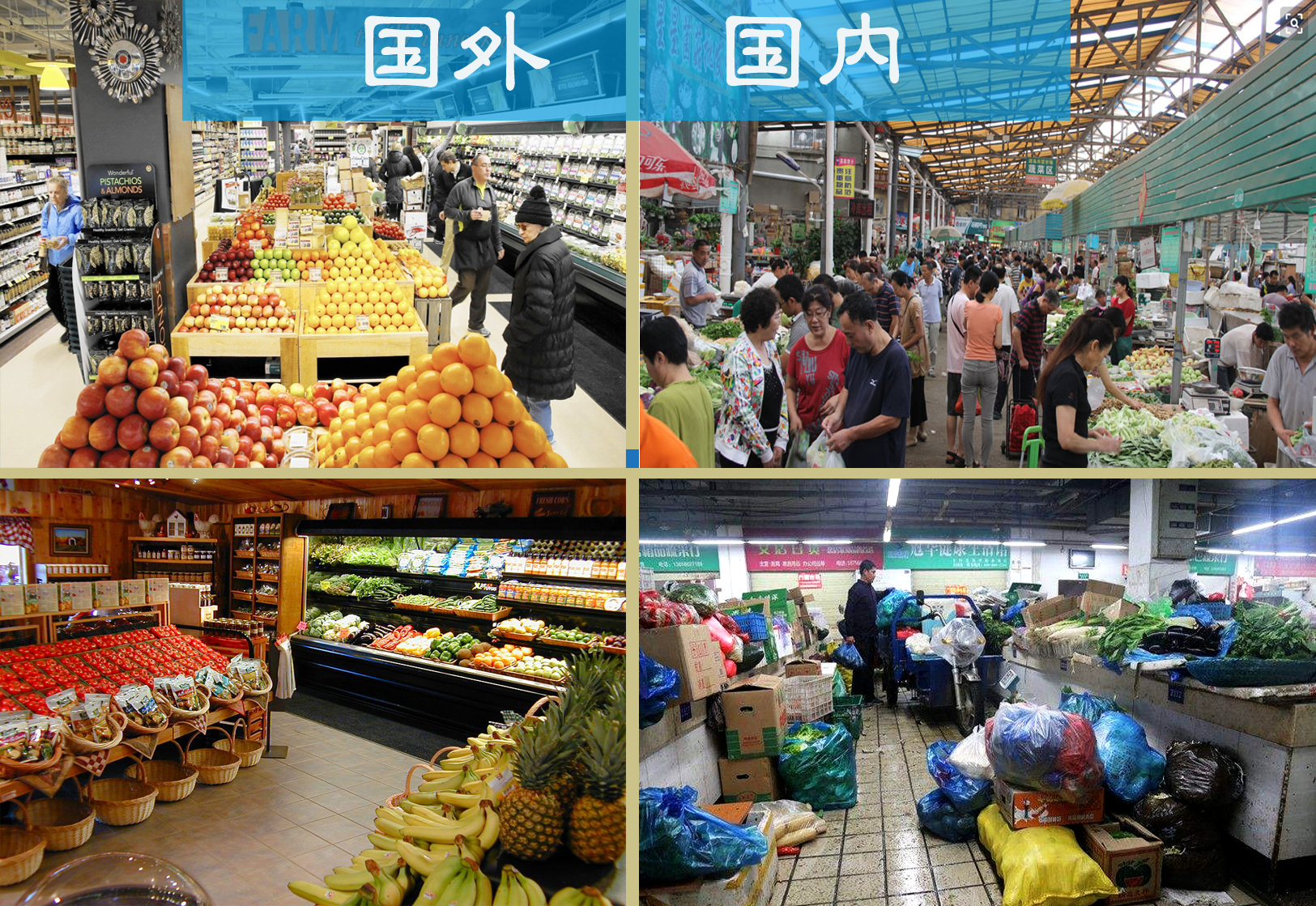 也正是这样普遍而又见怪不怪的农贸市场,让人很容易忽视它的存在,而且在生活物资极大丰富的今天,那里更是愈发显现出与城市繁华、时代进步的格格不入。甚至说对照国人传统的“外国月亮比中国圆””的认知模式,农贸市场也是国外的好,恨不得天天逛,那么事实真的是这样么?让我们先看看一组对比吧!