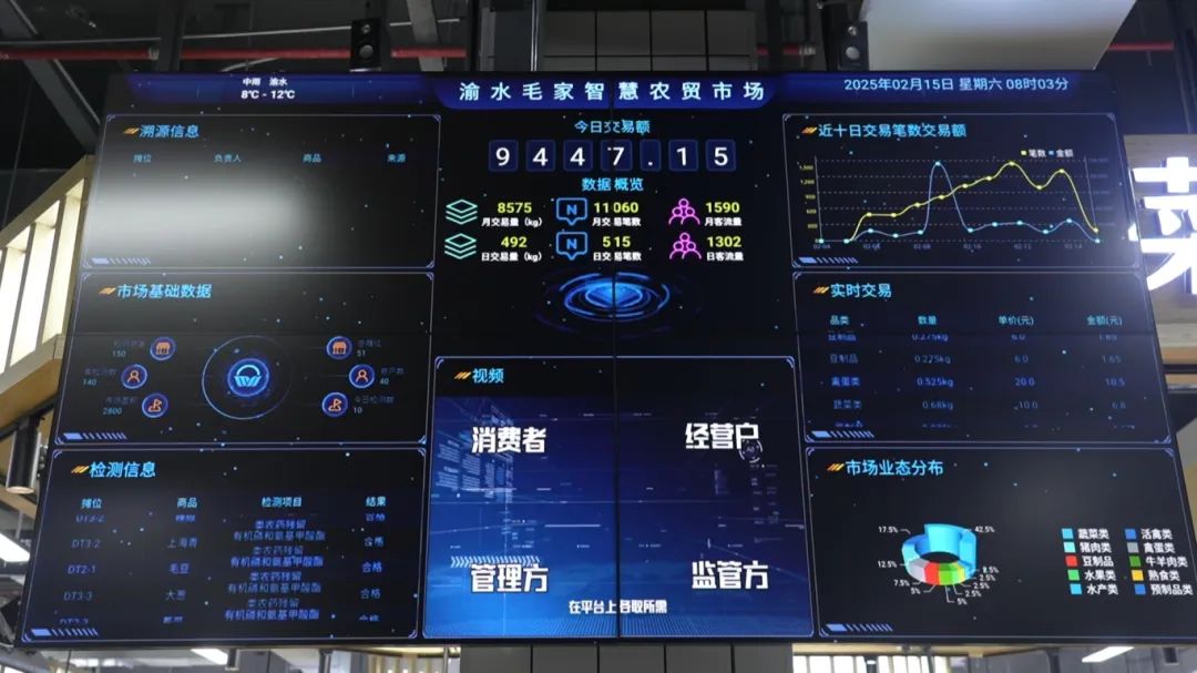 【渝水毛家智慧农贸市场负责人 李春敏:我们这个农贸市场引进了一个凯发旗舰,通过产品的溯源,包括我们的智慧称,还有我们的显示屏,它可以统计到我们每天的成交量,还有摊位的经营情况,包括摊位产品质量的监督,我们每天会在9点之前,做一个快检,通过智慧屏公式出来。我们根据行业主管单位指导意见,由脏到干净整洁的划分,在市场的东面是干货区,市场的西面是活禽和水产区,这样的话就是干湿分离,一个脏乱分离。】
