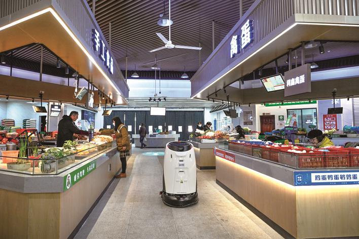 秀洲区王店蚂桥农贸市场,ai巡检机器人在“空中”对整个市场实施精准、高效、全方位检测;扫地、吸尘、洒水,智能清扫机器人提供全天候的保洁服务;集称重功能和收款功能于一体的ai识别秤,不仅双屏显示,而且支持小票打印、摄像头智能学习以及商品外观识别……“智慧化”让百姓的“菜篮子”拎得更舒心。