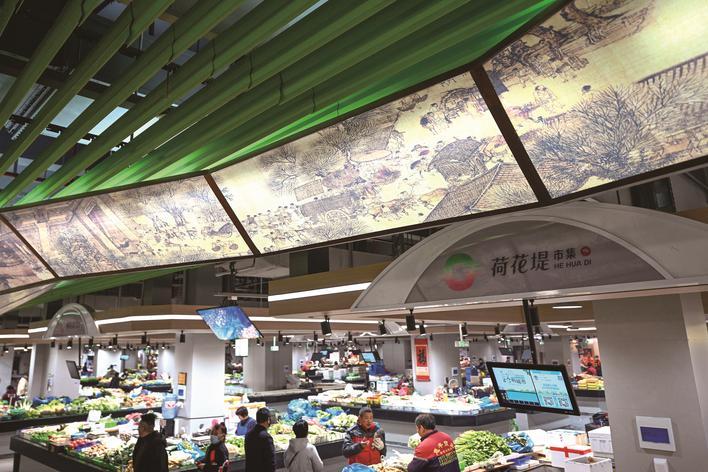 荷花堤市集农贸市场,现代简约风格的装修,绿色的吊顶线条上缀着《清明上河图》的装饰画。