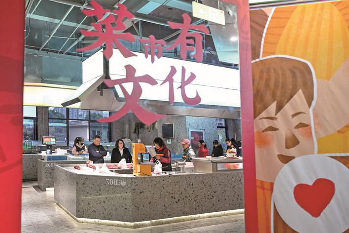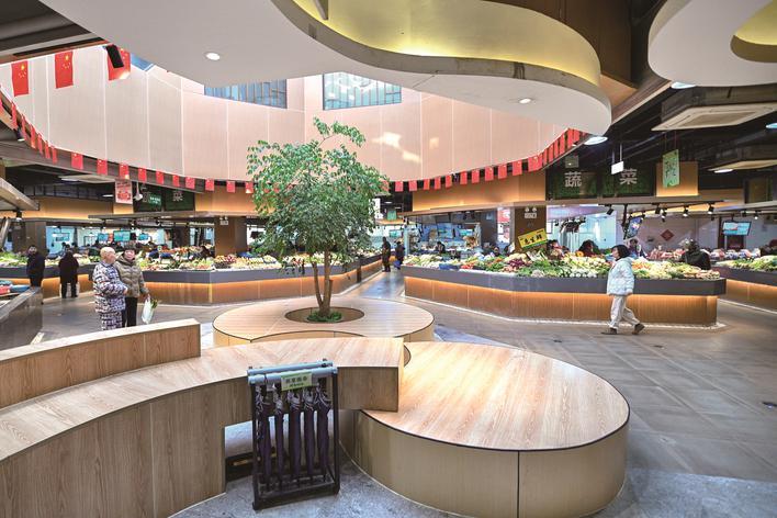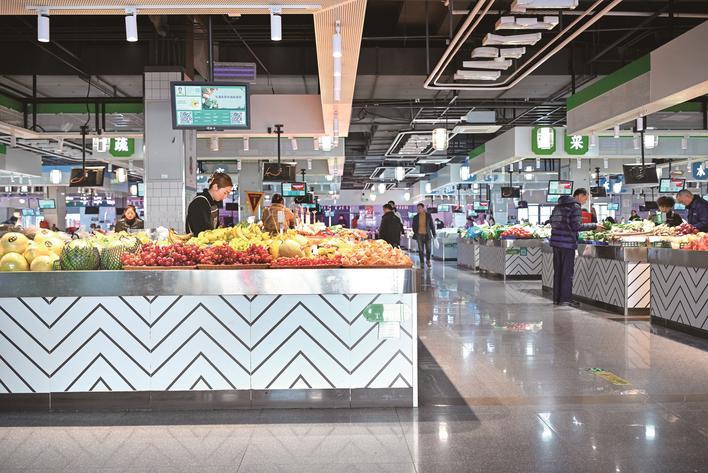 在2025年春节前夕,备受期待的荷花堤市集农贸市场在完成迁建后正式开业。这座四层楼的市场配备了多部电梯和自动扶梯,拥有开阔明亮的空间和现代简约风格的装修。绿色的吊顶线条上装饰着《清明上河图》的元素;而配套的商业街则巧妙融合了街、巷、桥等江南元素,彰显了江南韵味。拥有近500个智能停车位的地下停车场和采用蜂窝铝板等现代材料构成的外立面,赋予了市场极强的现代感……这里更像是一个大型商超,既充满“烟火气”又不失“时尚感”。