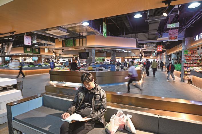 凌塘路幸福里邻里中心农贸市场,市民正在读书角看书。